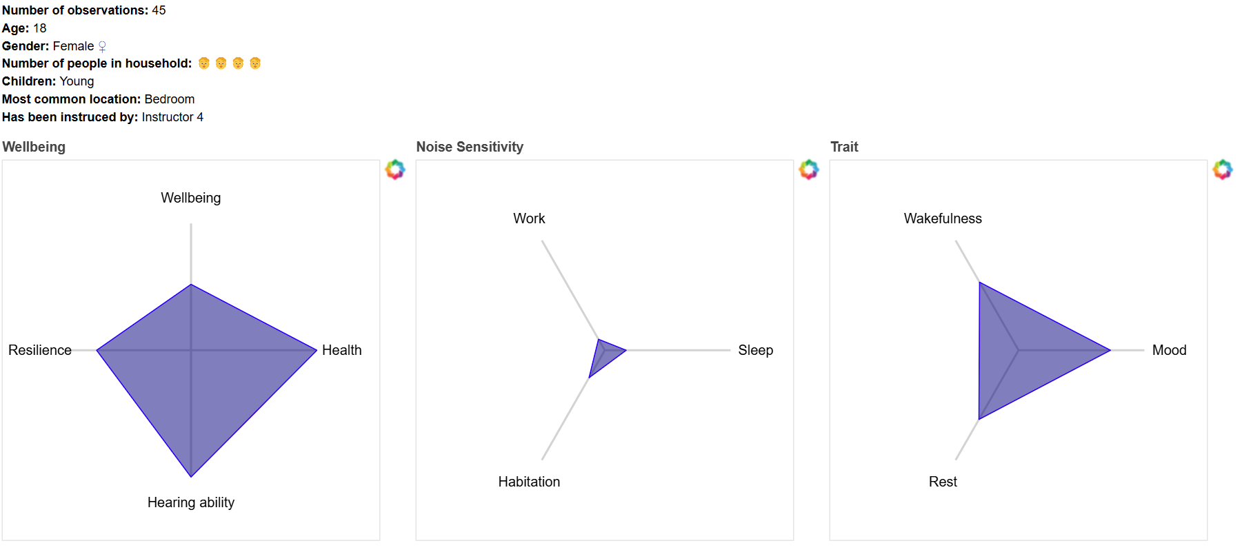 First, I wanted to find a way to visualize the different personalities. I used a cluster of radar charts to show the personal factors in three fields: wellbeing, noise sensitivity, and trait. You can see an example of this at the top of this blog post.